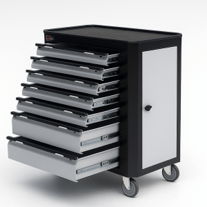 • Özellikleri: Dayanıklı çelik gövde, bilyalı raylı çekmeceler, merkezi kilit sistemi, ağır yüke uygun tekerlekler (genellikle ikisi sabit, ikisi döner ve frenli), üst çalışma tablası.
