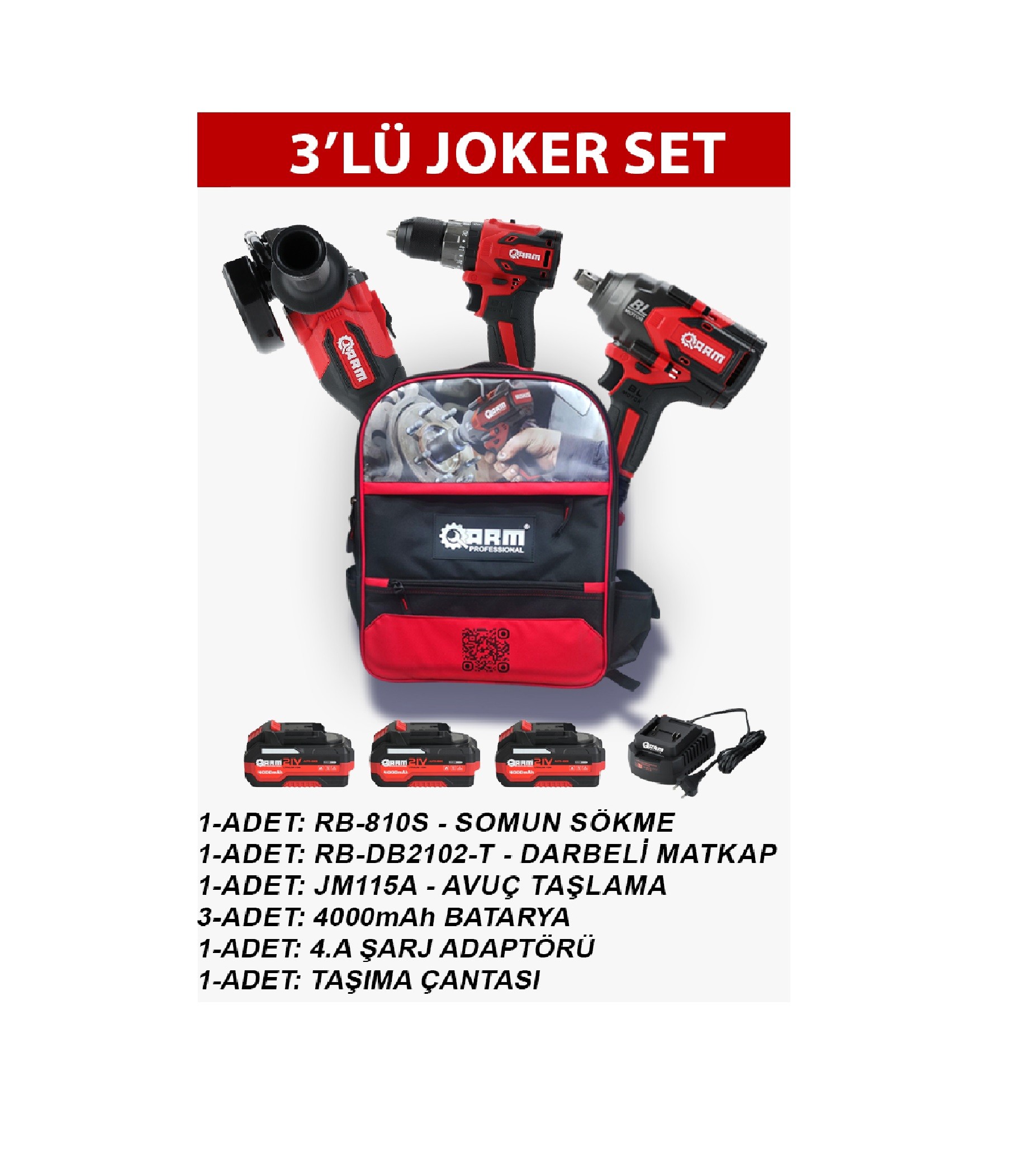 ARM Şarjlı Somun Sıkma + Cırcır + Avuç İçi Taşlama Joker Seti, çok yönlü bir set olup, farklı atölye ve ev ihtiyaçlarını karşılamak üzere tasarlanmıştır. “Joker Set” terimi, genellikle setin farklı kullanım alanlarına yönelik çeşitli aletleri bir araya getirdiğini ve geniş bir iş yelpazesine hitap ettiğini ima eder.