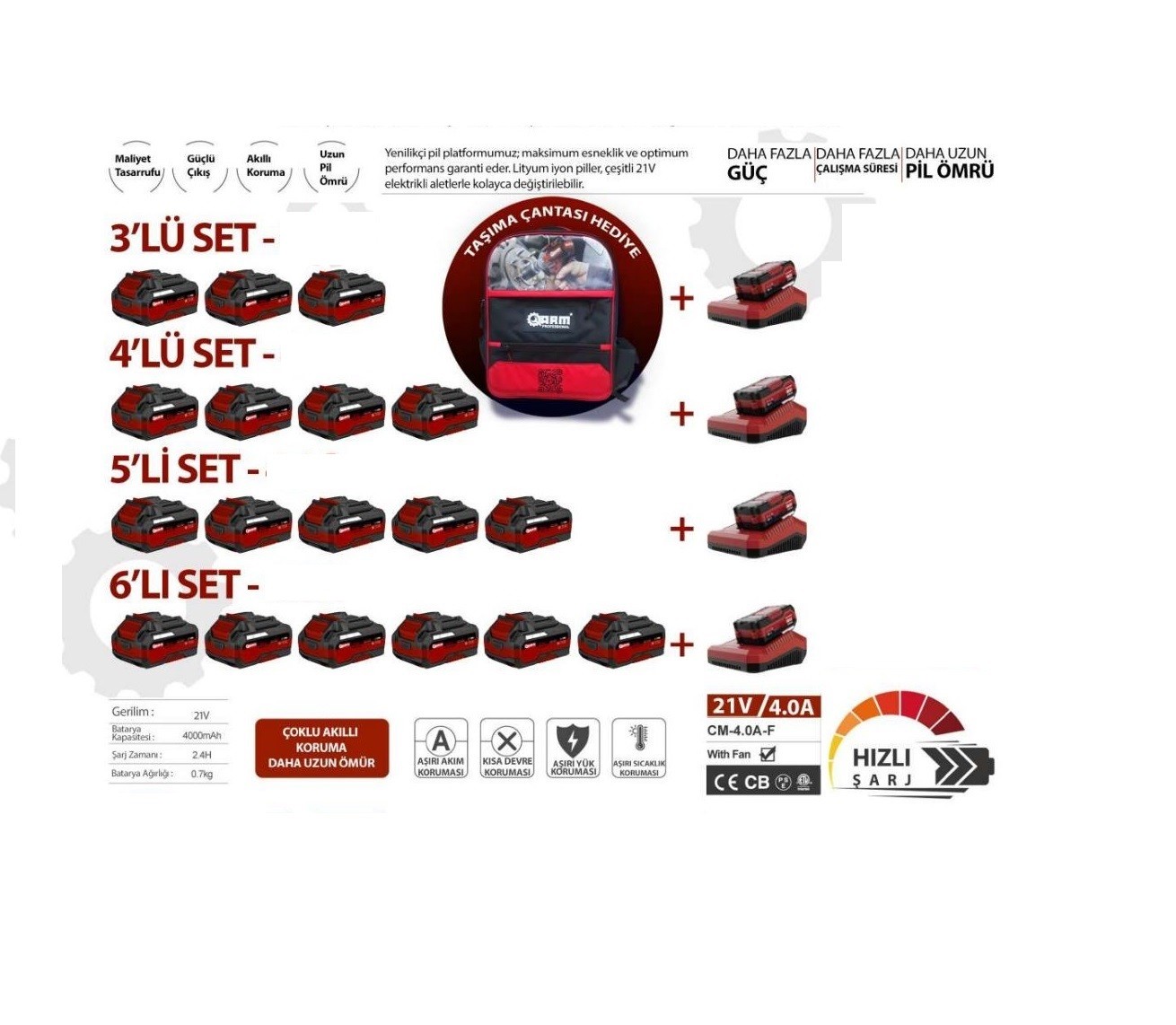 - ARM Uyumlu Şarj Cihazı: ARM markalı 21V Li-ion akülerin güvenli ve hızlı bir şekilde şarj edilmesini sağlar.