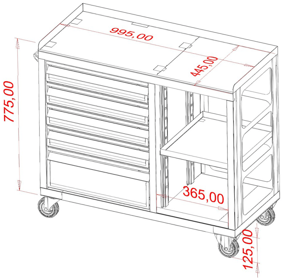 - Raflar: Çekmecelerin yanı sıra, genellikle bir veya iki açık rafa sahiptir. Bu raflar, sık kullanılan aletlere veya daha büyük, kutulu malzemelere hızlı erişim sağlamak için idealdir.