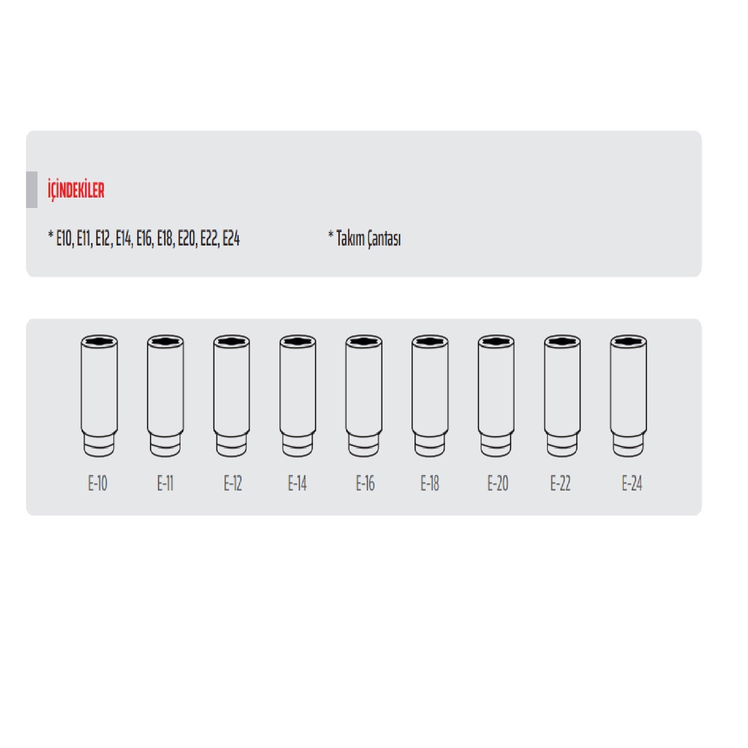 Dış Torx (E-Tip) / Yıldız Lokma Setleri: Bu set (İç Torx), E tipi dış Torx cıvatalarını sökmek için kullanılır. (Torx cıvataların yuvaları yıldız, bu lokmaların uçları ise yuvalara uyacak şekilde yıldız şeklindedir.)