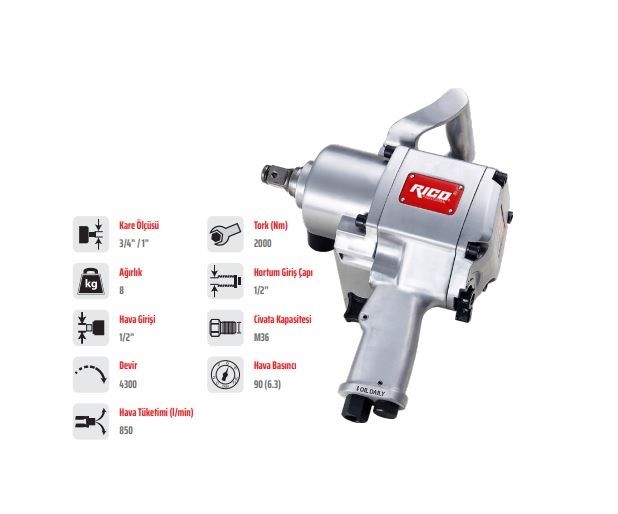 Rico 1” Çift Çekiç Kısa Havalı Somun Sökme Sıkma 2000Nm