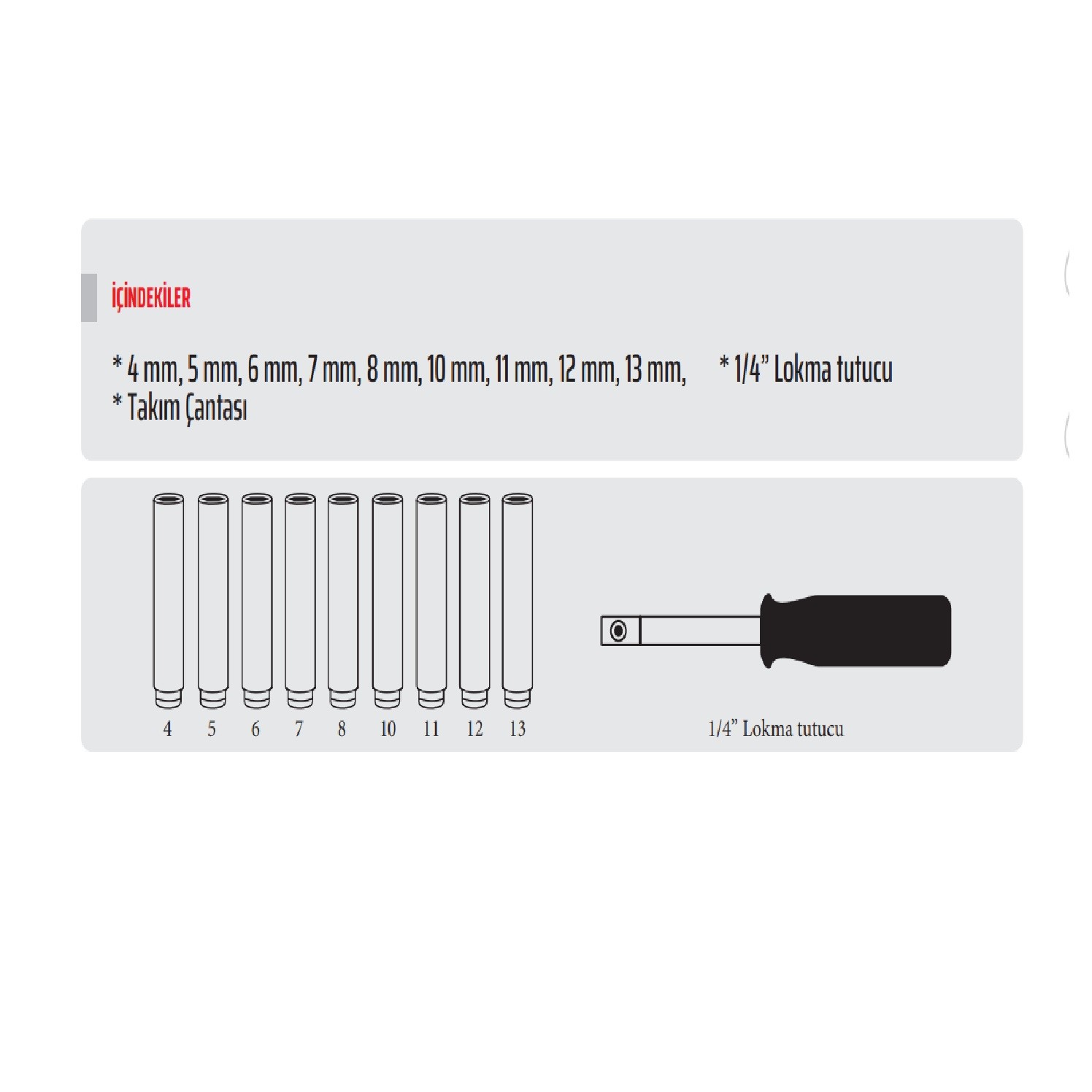 - 4 mm, 5 mm, 6 mm, 7 mm, 8 mm, 10 mm, 11 mm, 12 mm, 13 mm, * 1/4” Lokma tutucu