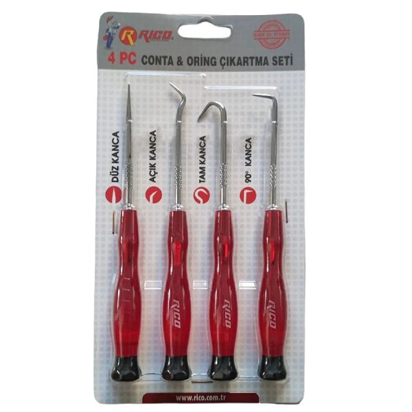 003-KK1973 Rico 4 Parça Oring Sökme Seti, conta ve o-ringleri sökmek ve takmak için özel olarak tasarlanmış 4 parçadan oluşan bir alet setidir. Otomotiv, havacılık, hidrolik ve diğer birçok endüstriyel uygulamada kullanılmaktadır. Set, farklı boyutlarda ve şekillerdeki contaları ve o-ringleri sökmek için ihtiyaç duyacağınız tüm aletleri içerir.