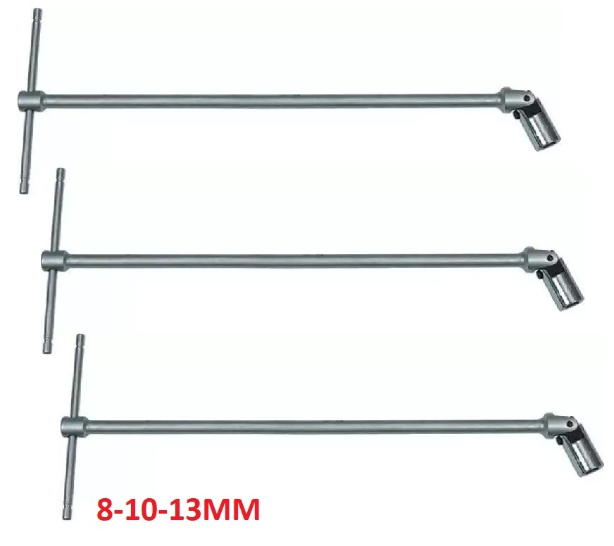 Rico 8-10-13 mm Mafsallı T Kol, somun ve civataları sökme–sıkma işlemlerinde kullanılan, uç kısmı mafsallı yapıda olan ve birden fazla lokma ölçüsünü aynı gövdede sunan çok amaçlı bir el aletidir.