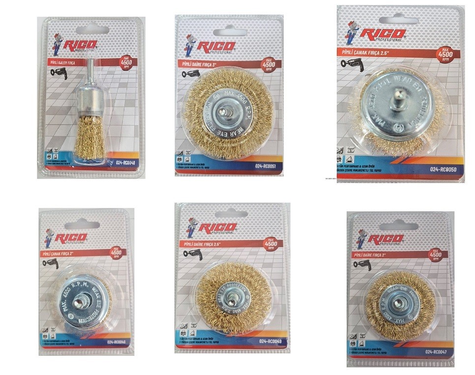 Rico Pimli Daire Çanak Tel Fırça Seti 6 Parça, metal yüzey temizleme, pas sökme, çapak alma, boya kazıma ve yüzey hazırlama işlemlerinde profesyonel kullanım sunan, farklı çap ve tasarımlardaki tel fırçalardan oluşan çok amaçlı bir settir. Tek paketle tüm yüzeylere uyum sağlayan bu set, sanayi tipi dayanıklılığıyla uzun vadede maliyet avantajı sağlar.
