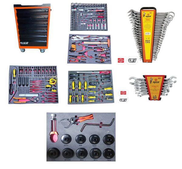 Bir Rico dolu takım arabası içerisindeki tornavida setinin içeriği, takım arabasının modeline ve büyüklüğüne göre değişiklik gösterebilir. Genellikle aşağıdaki gibi bir içerik bulunur: