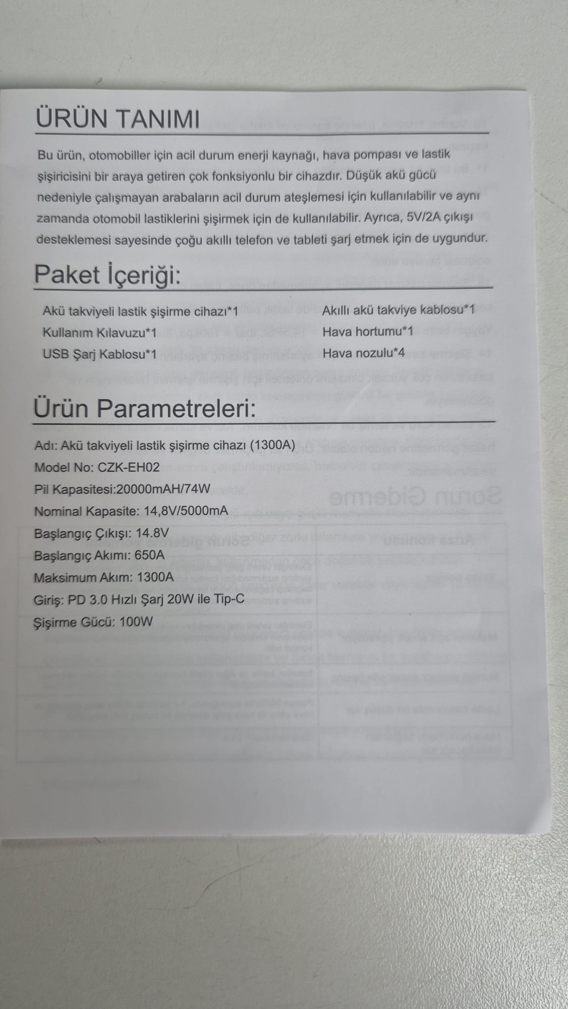 • Şişirme Gücü: 100W gücünde hava pompalama özelliği.